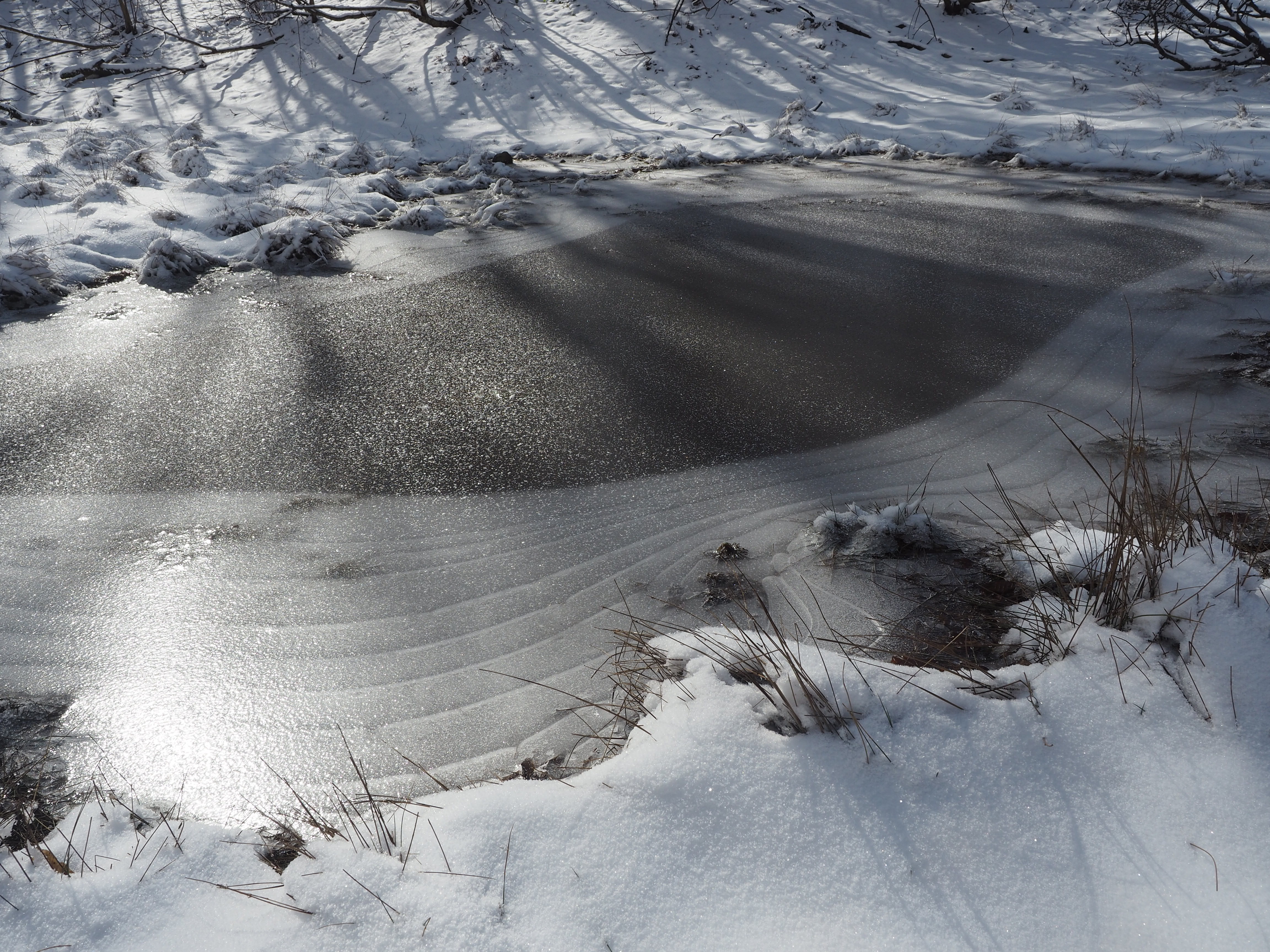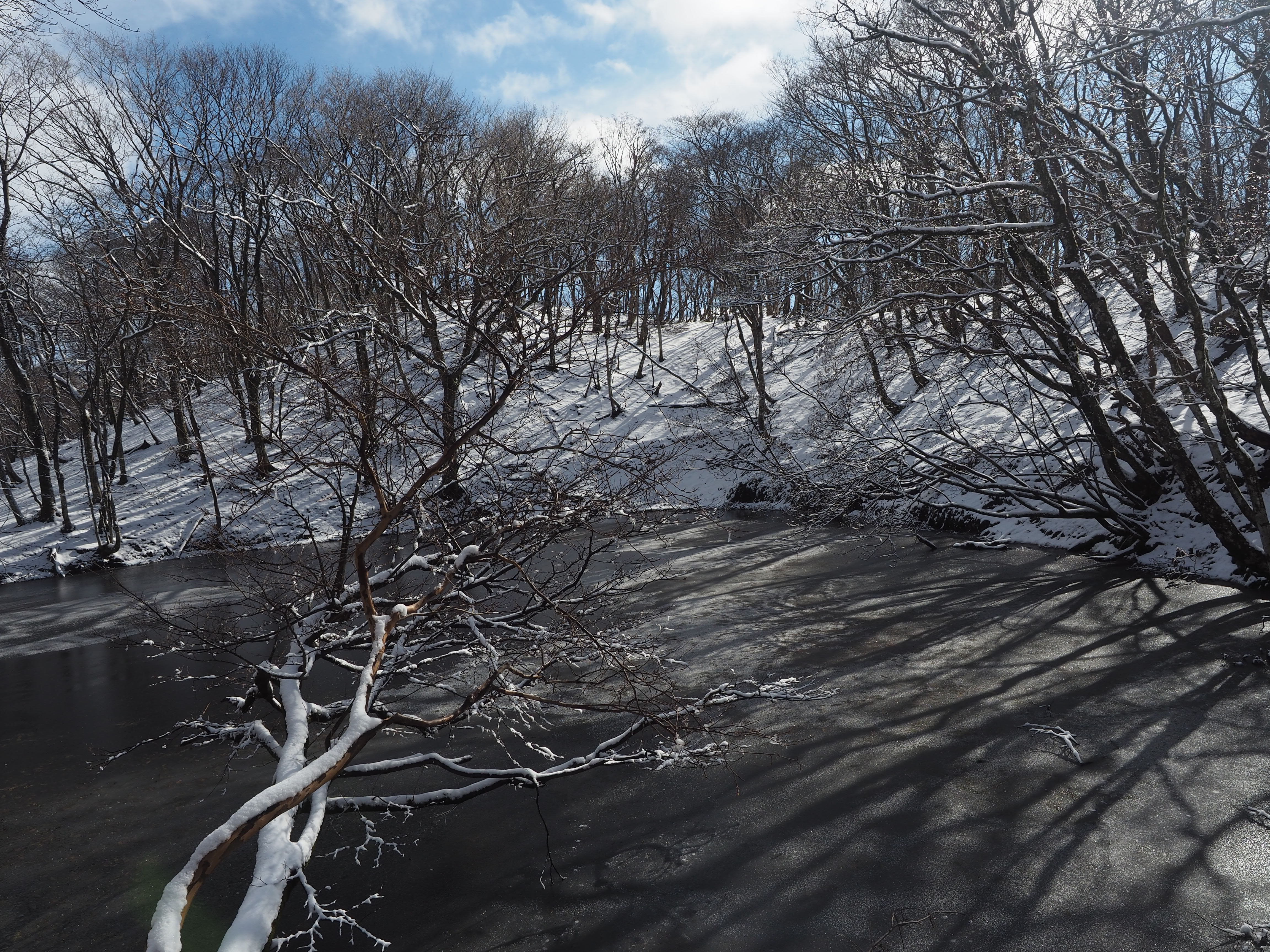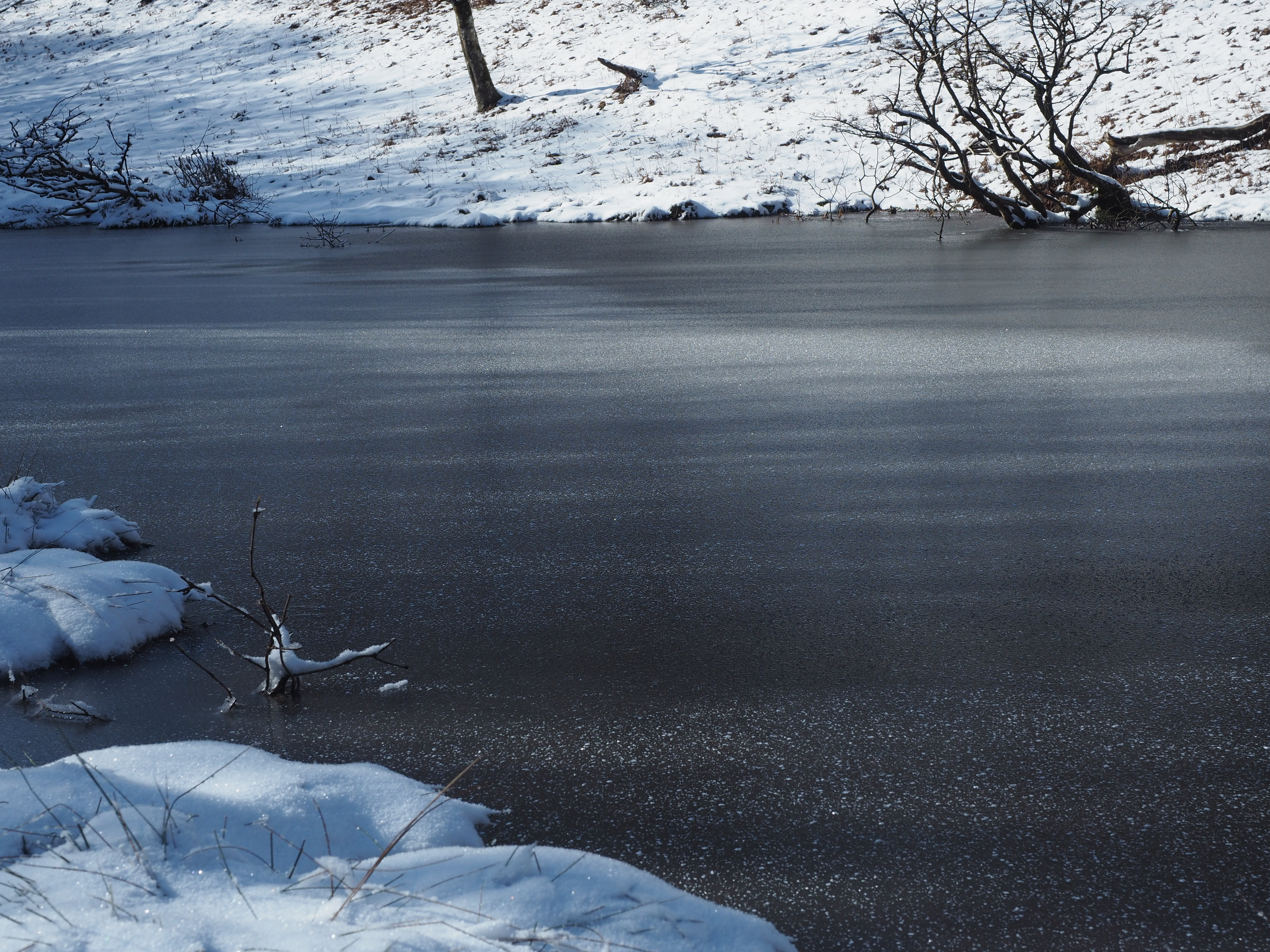 再び少し東に戻り、小さな鞍部を越えて南側の谷に出ると谷に沿って広い水溜まりがある。谷沿いに再び西に進んでもう一つの池に辿り着く。ここは薄氷が均一に水面を覆っているが、氷の厚みのせいだろう、池の中央部には乳液を落としたかのような大きな白いまだら模様を描いている。