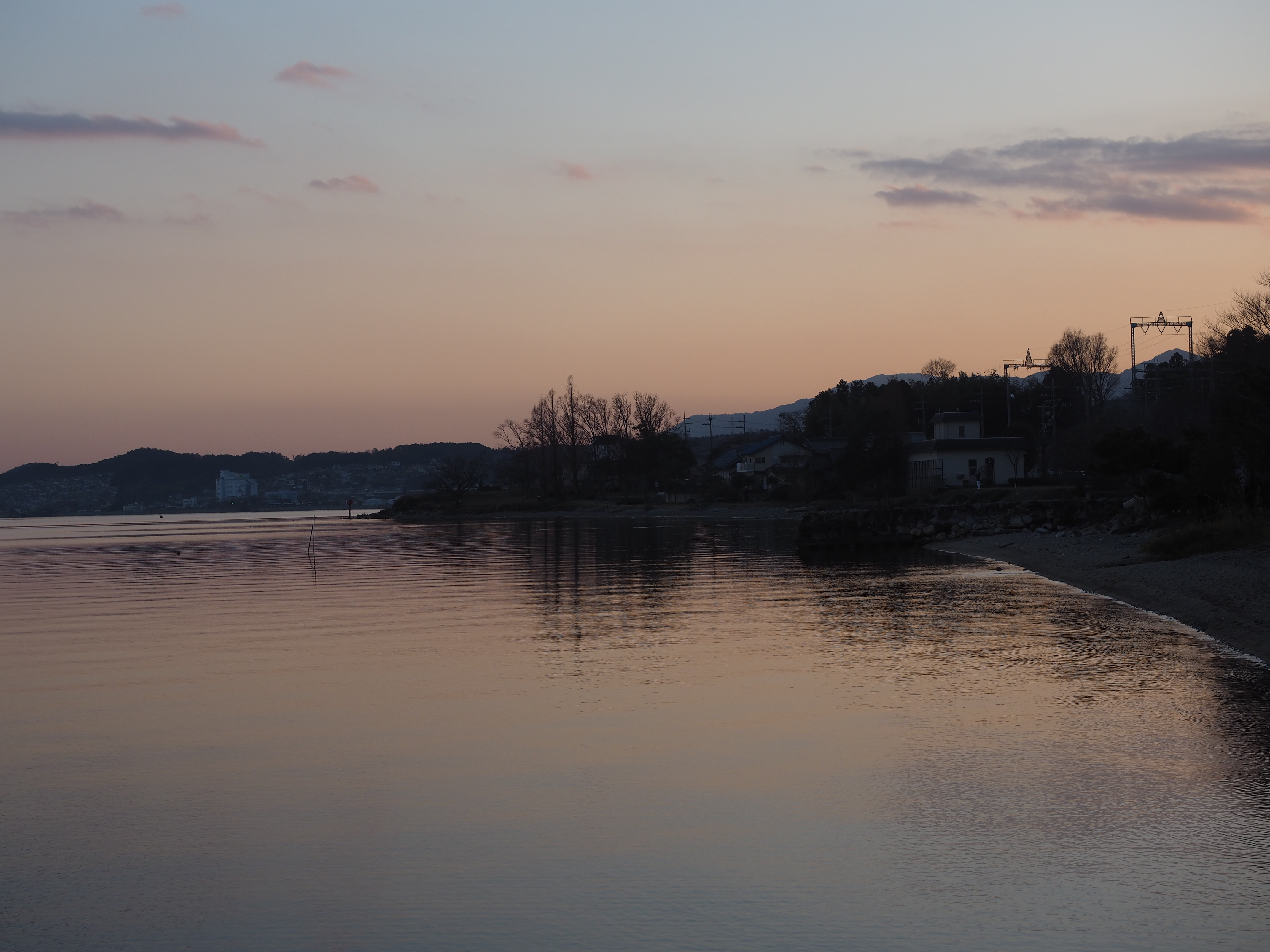 歩いて志賀駅に向かうと、駅に着く直前で、湖西線の電車が高架を走ってくるところであった。仕方がないので駅を通り過ぎて、琵琶湖の湖岸に出る。丁度、日が沈んだところだ。雲ひとつない空と湖面に広がる残照のパステルカラーが高ぶった心拍を鎮めてくれるのだった。