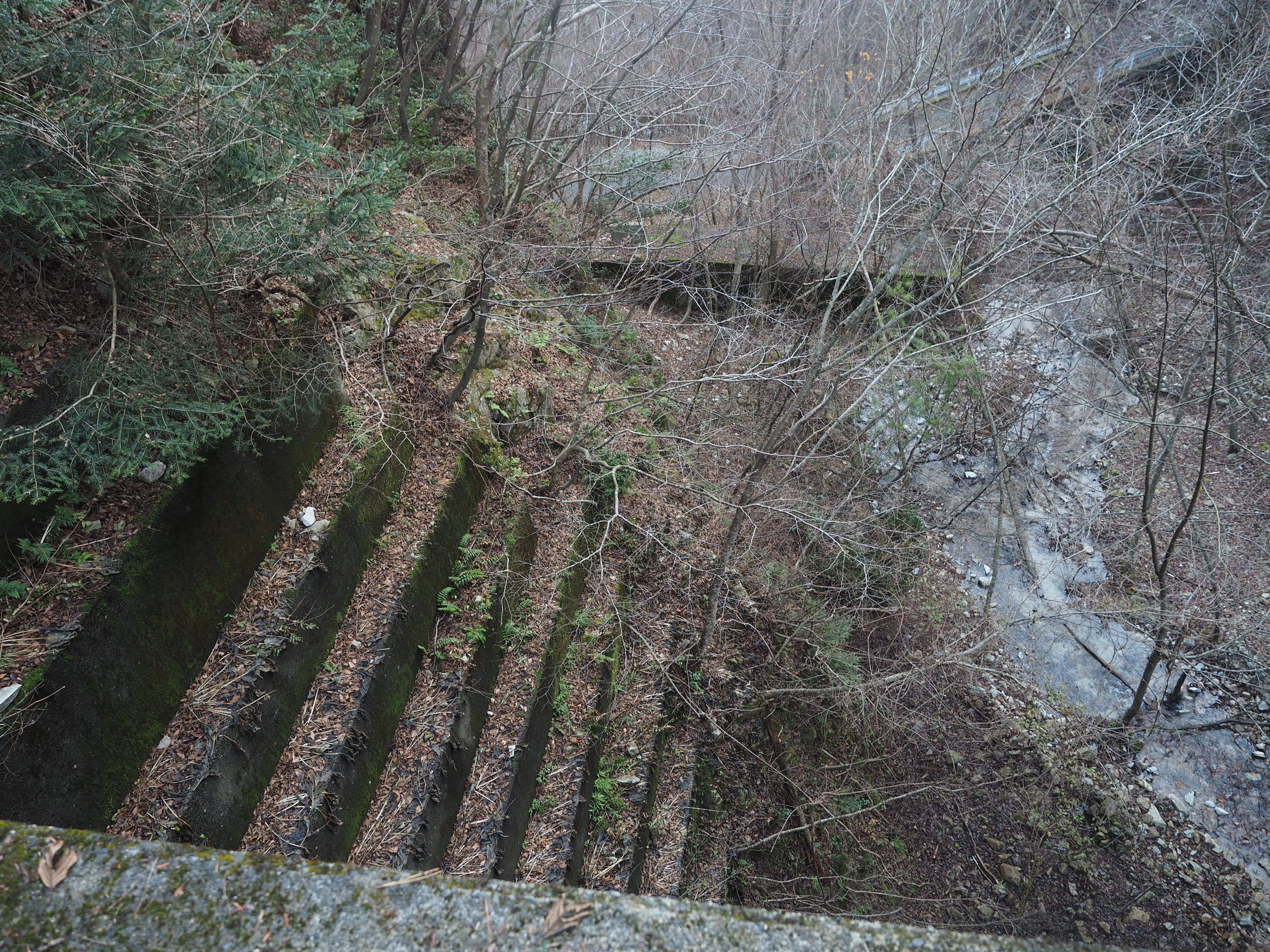 慎重に樹々の幹を掴みながら斜面を下り、この堰堤の両側は崖に近く、ほぼ懸垂下降に近い状態で再び樹の幹を掴みながら斜面を下り