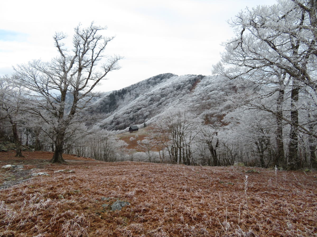 赤ゾレは白く見えなかったようですが、ここは白かったのね。ここでは1本2本だけ薄っすらと霧氷が付いているだけでした。