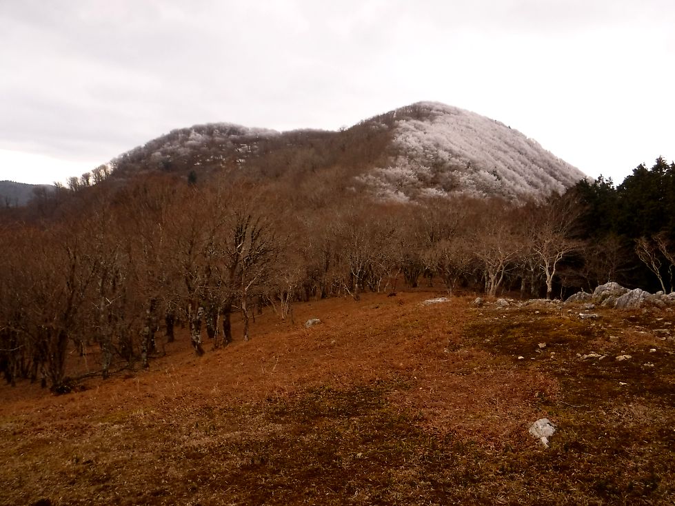 稜線に登ると水無山の西斜面が霧氷で真っ白だ。急いでウシロ嵓に向かう。(急ぐ必要もないのに)
