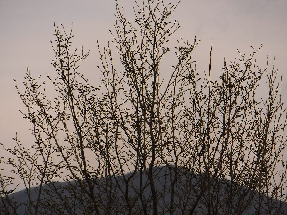 木梶分岐から東へ歩くと枝先の白い木が見える。