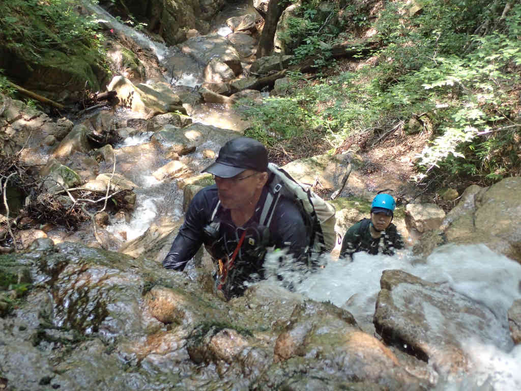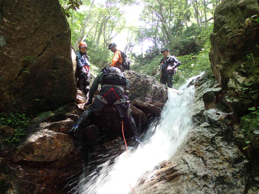 釜を対岸に泳ぎ渡り,流れの左をフリーで登ってメンバーを引き上げる。引き上げるといっても固定ロープにアッセンダーを使って登ってきてもらうので,私は上から見ているだけである。この滝はホールドがたくさんあるので,見た目ほど難しくはない。