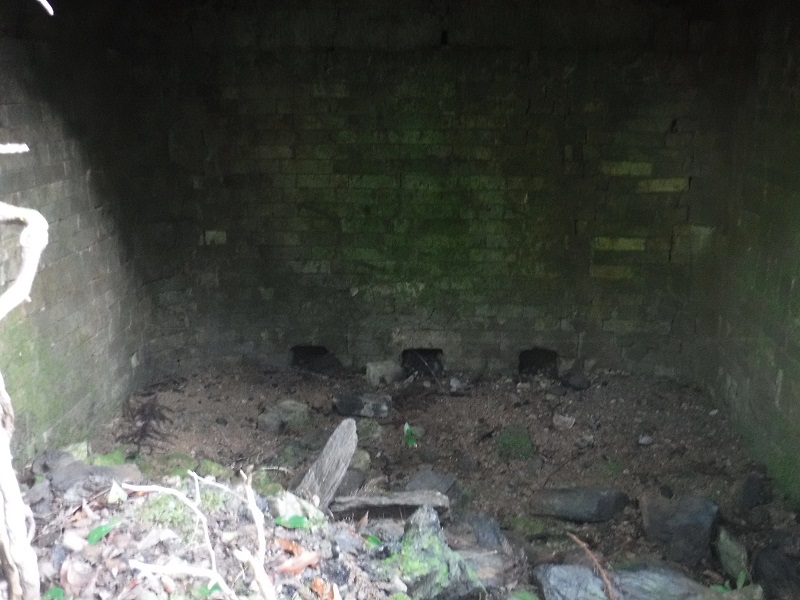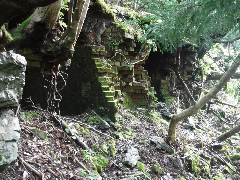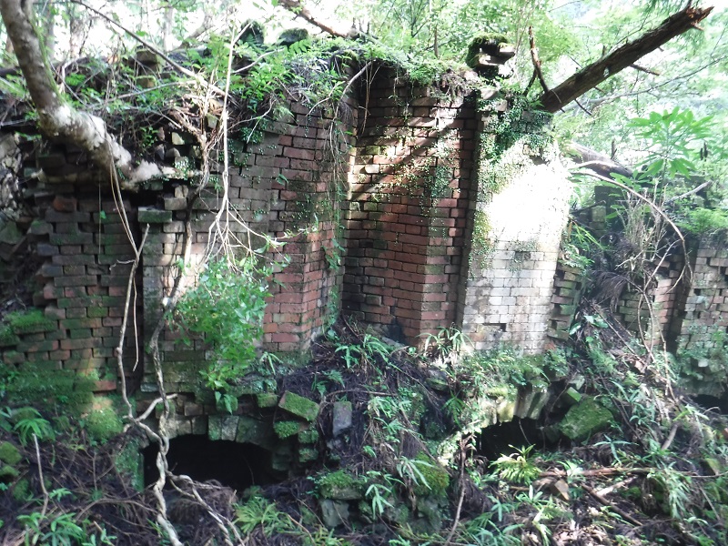 そのまま道を進むと左手にレンガの構造物が見えてくる。4窯並列の大正5年式岩本式木材乾留炭化装置で、火床は耐熱レンガで作られ上部は赤レンガで作られている。4窯4火床の構造のようだが1窯の火床は埋もれたようで3火床しか確認できなかったが前部は大部分残っている。大正5年式は木材の仕込み口が後方についており大きくレンガが開いている構造のせいか前方に比べて後方は大きく崩れていた。この後方に煙突がありここから土管をつないで冷却していた。最初は8寸土管15間(24cm×1m80cm)を使い次に6寸(18cm)最後に3寸3分(9.9cm)の銅管につなぎ桶に木酸液をためる構造で、土管の幅が寸法どおりなのには驚いた。煙突から出て来た水分や熱気は土管で冷やされるのだが、土管はすぐに熱をおびるので冷水をかけた。このために乾留工場は水場の近くに設置されたようだ。ここの土管は割れてしまっていて土の中にほとんど埋もれていた。