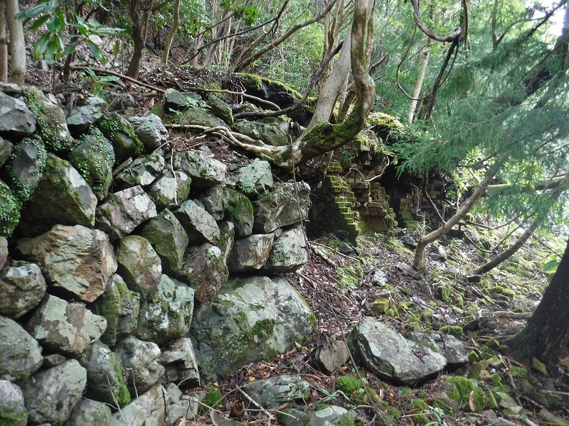 次に左岸の乾留工場を見に行く。対岸からは木に包まれて存在すらわからないが、谷を渡り上っていくと石垣が見え、その上に工場はある。右岸の工場は比較的広い場所にあるが、ここは山が迫り上部にも石垣を作り土砂の流入を防いでいる。この窯の前部は口を開けているが上部は残っている。窯の中の下部には煙突につながる空気穴もわかる。よく見ると火床が窯の下ではなく、窯と窯の間にあり乾留窯の作りが違う。木材の仕込み口は前方になっていて2窯3火床の岩本式木材乾留炭化装置のようだ。しっかり残っている上部の煙突の口から土管が並んでいる。割れている土管も多いが、残された土管は一定方向に向かっており右手に3寸3分(9.9cm)の銅管につなげる大きさの土管があったので、ここに木酸液をためる桶があったのだろう。