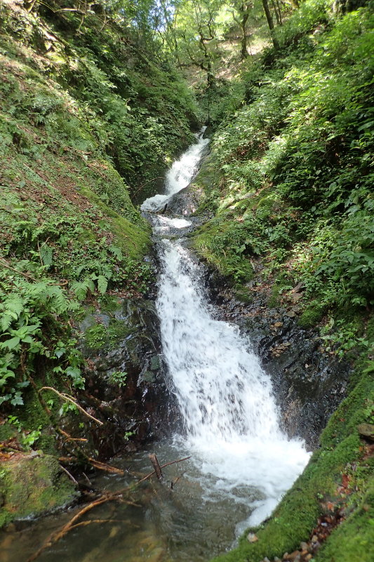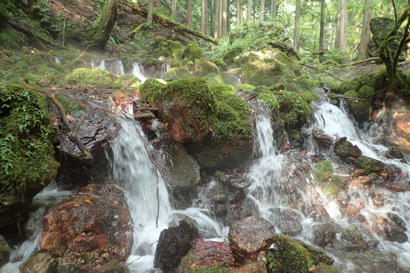 再び苔むした連瀑の登場でボルテージも上がってきた。と思いきや、滝を過ぎると植林の平流に逆戻り。