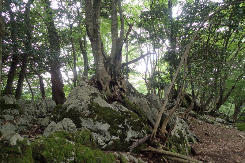この尾根の特徴のひとつが岩を抱いて伸びるケヤキの奇木である。その怪異な姿は怪獣のようにも見えるの