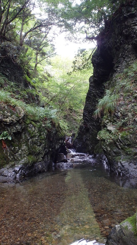 両崖がV字に切れ込んだゴルジュにやってきた。左手の右岸中段から古い残置ロープが下がっているが、使う気にはなれない。淵が深そうだがなんとか股下くらいで通過できそう。そう思って、いつもは足元の石が動いてドブンとなる。だから今回はいっそう慎重に通過。