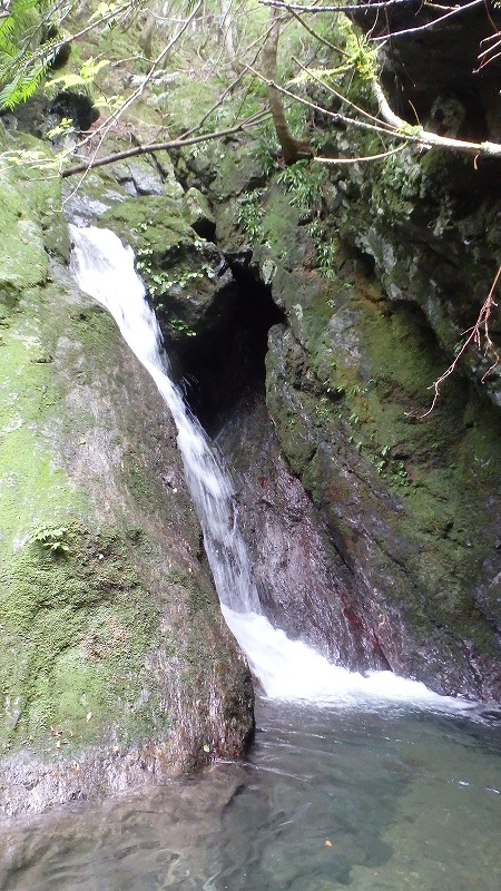 両崖がV字に切れ込んだゴルジュにやってきた。淵が深そうだがなんとか股下くらいで通過できそう。そう思って、いつもは足元の石が動いてドブンとなる。だから今回はいっそう慎重に通過。ゴルジュにひっかった倒木を越えて、続く段滝をクリア。短いが磨かれた滑り台のような滝もある。