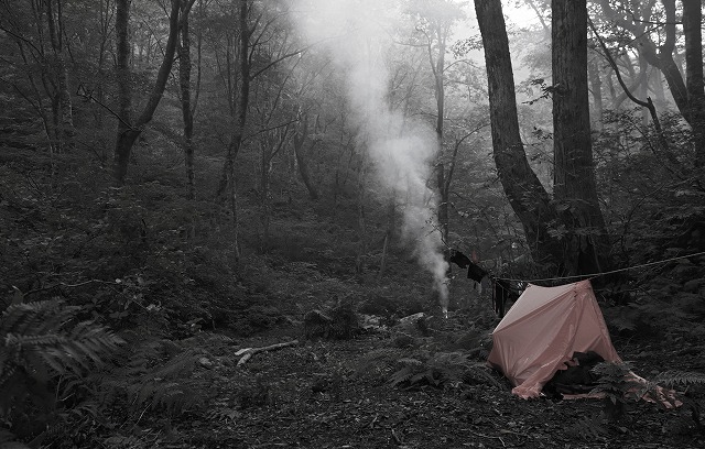そこに焚火の煙がたなびく。そして、巨木を縫う谷間にいつまでも漂う。
