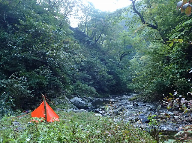 う〜ん、早いテン泊。てか、ここまで下るのにこの時間って?味わい尽くしてる?高丸に源を発する大きな支流の手前で左岸の小広場を今宵の酒場とする。