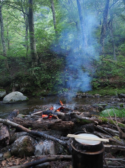 渓泊の朝は早いが焚火、朝飯、寝床の撤収など時間がかかる。