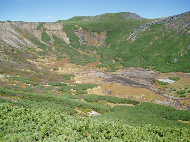 藪っぽいルートに辟易しそうな時、前から賑やかな人の声が聞こえてきました。老々男女10人ばかりのグループが降りてきました。週末でも人に出会うことはめったにない所なのでびっくりしました。聞けば前日五ノ池小屋に泊まって今日は麓の木曽温泉まで歩いてタクシーを呼ぶということです。8合目付近はヤブっぽいと書きましたが、実は下山の時慎重に下ったらガレ谷の左右どちらかにほとんど脇道が付いていて枝をかき分けたりする必要はありませんでした。