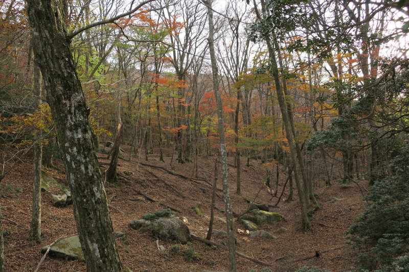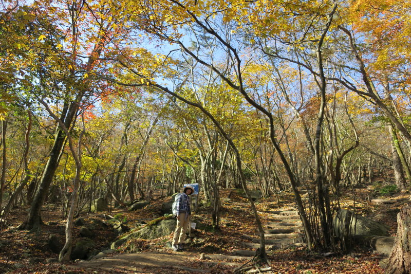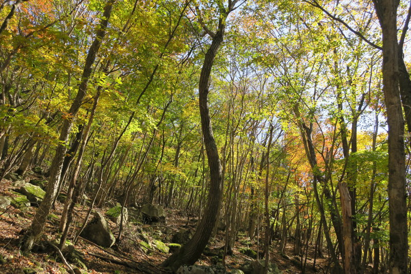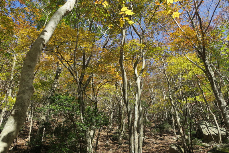 ヤシオ尾根からブナ清水への下降路に入ると、見事に色付いた二次林が出迎えてくれた。