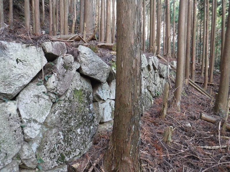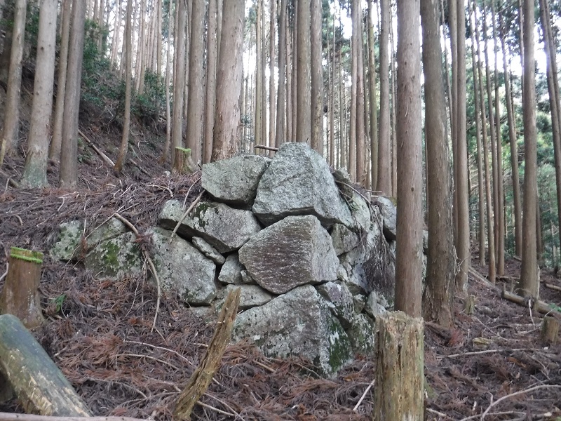 水沢鉱山跡が残っているようなので、宮妻峡に向かった。駐車場から林道を歩き中ノ谷を渡る橋のあたりから中ノ谷と宮妻谷にはさまれた植林の尾根を上って行くと道に出てテープもある。そのまま上っていくと大がかりな石積みが植林の中にあり、地元で「地形場」と呼ばれている。精錬所跡もしくは飯場跡であったと言われているようだ。