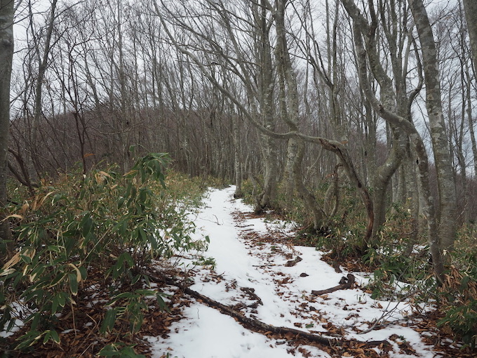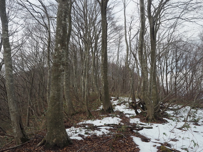 大黒山には丈の低い熊笹が繁茂する細い尾根を辿る。大黒山の手前で尾根が広がるようになると、再び樹高の高い山毛欅の樹林が続く。大黒山の山頂にかけて壮麗な樹林の中を登って行くのはこの変化に富んだ山行の最終章に相応しい高揚感を味わう。山頂直下では登山道に再び薄雪が現れる。
