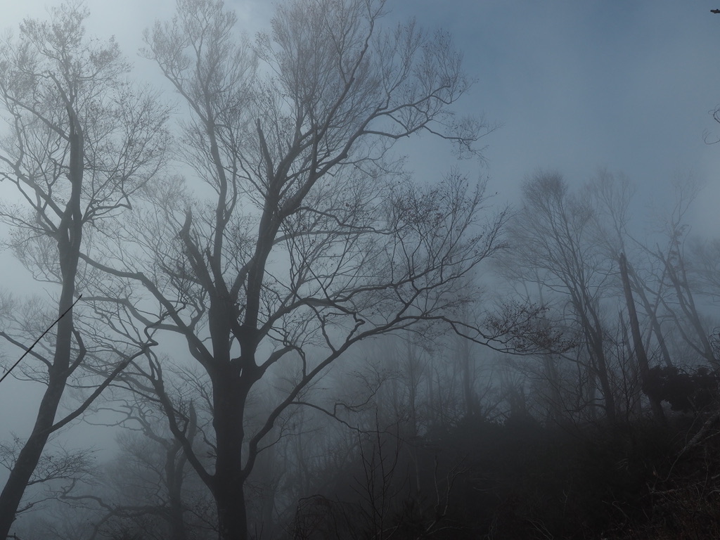 上丹生から登ってくる一般登山道と合流すると尾根の勾配はきつくなるが、明瞭な登山道は歩きやすく、俄然、スピードアップする。山頂のあたりは雲に覆われたままであるが、登るにつれて徐々に雲の高さも上がって行くようだ。山頂が近づき、いよいよ雲の中に入っていくかと思いきや、頭上でみるみるうちに雲が薄くなる。樹高の高い山毛欅の梢の彼方に蒼空が見え始めると、青い霧がかかっているかのような幻想的な光景が頭上に広がる。