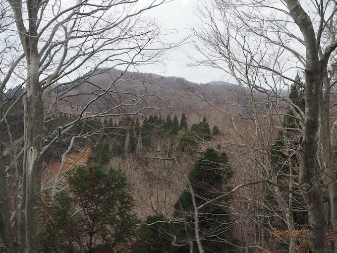 北側斜面を下るとすぐにも山毛欅の林は植林に変わり、左手に廃林道が現れる。使われなくなって久しいと思われる林道は完全に藪化している。辛うじて薄い踏み跡が林道の藪の中に続いている。しばらくすると林道上の藪はなくなり、なだらかな尾根の上を快適に進むことが出来るようになる。植林地から自然林の林へと変わると明るい尾根の雰囲気は悪くない。