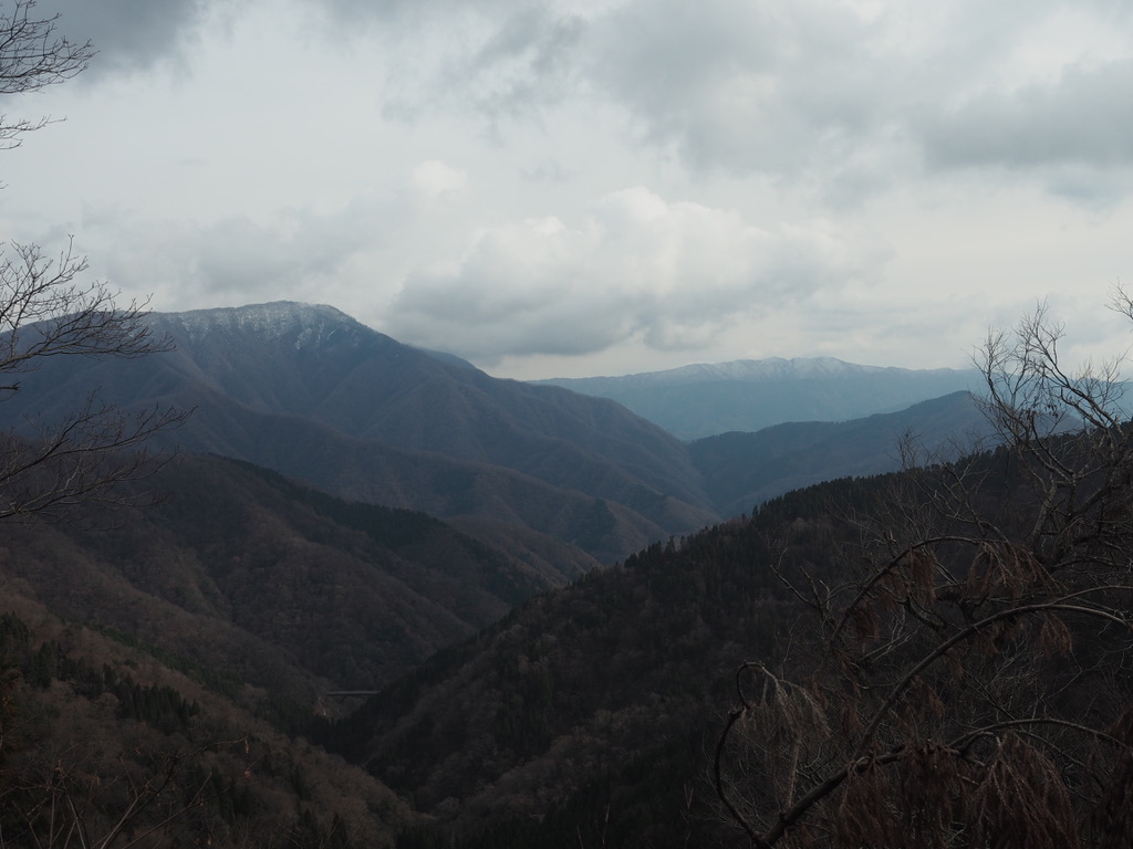 樹間からは遠くに大黒山が見える。手前のピークは鯉谷だろう。果たしてあそこまでたどり着くのどれほどの時間を要するのだろうかと思うほど遠くに感じられる。