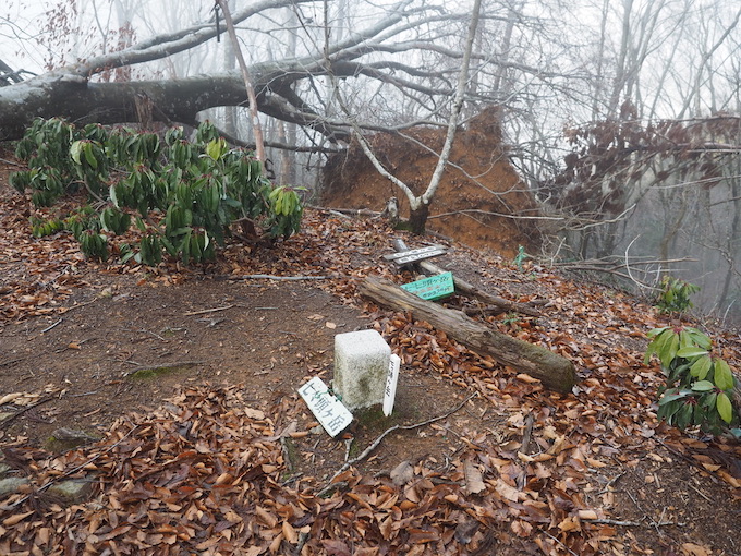 七々頭ヶ岳の山頂は数多くの倒木、それも山毛欅の樹々の間にある杉の樹が倒れているものが多い。山頂には西林寺という名の小さなお堂がある。お堂の扉は半開のままなので、閉めようと試みるもビクとも動かない。お堂の説明によると中には観音像があるらしいのだが、その姿は見当たらない。