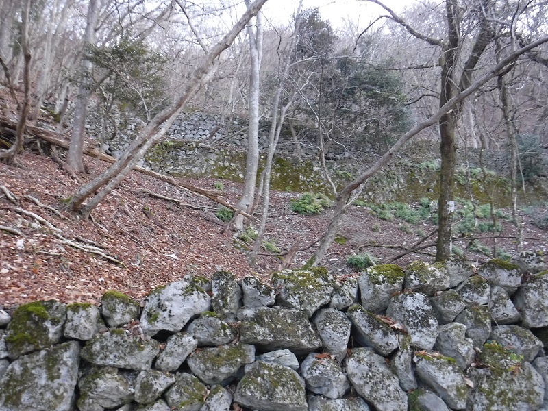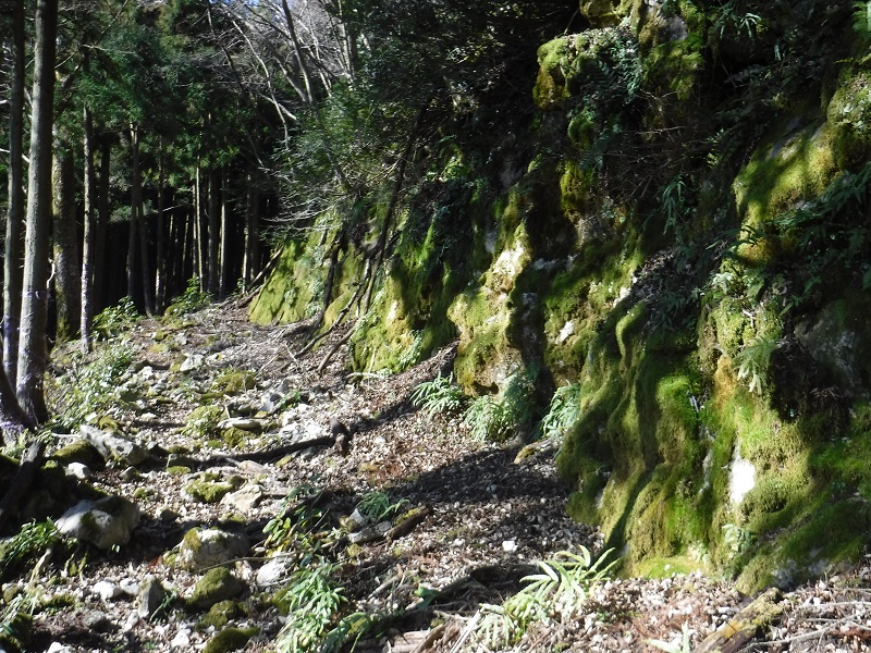 カワタニ越の道で、476独標の西の乗越をカワタニ越と呼んだようだ。破線道の通っているP608とP639のコルがミヤマ峠だが、甲頭倉への急降下の斜面は西尾本が書かれた時点ですでに厳しく破線道はたどれない。カワタニ越の道はミヤマ峠道と分かれて北西に延びて途中で無くなっている破線道を進み平坦な植林の谷が続きこのまま詰めあがると男鬼越に至る。この道はたくさんの石垣で守られ岩を削って道幅を確保している所もあり立派な道だ。男鬼集落の中心と入谷集落の中心を結ぶ道だけに利用度は高かったのだろう。植林のあたりで男鬼越の道とは分かれて目の前にあるP639の北西のコルに向かう。コルは高取山城南尾根にあり、ここから男鬼入谷城跡への登山道は尾根を上って行く。コルの甲頭倉側には溝道が続いており20分で甲頭倉の寺のあたりに下りて来た。