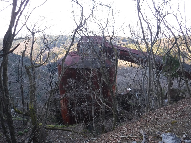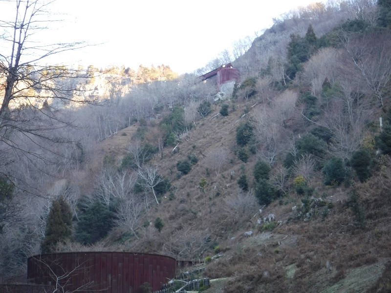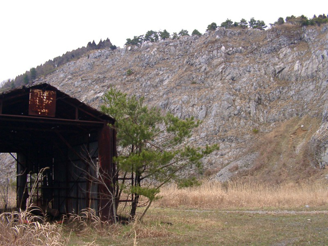 採石場を奥に進むとテープがあり後谷から見えた巨大なサイロがある。上の採石場につながる車道が続いているので進むと上段の建物がありその先が採石場だった。戦前の昭和10年にできて昭和39年に閉鎖された住友セメントの採石場で、後谷、屏風、甲頭倉を中心に芹谷一円から働きにきていたそうだ。