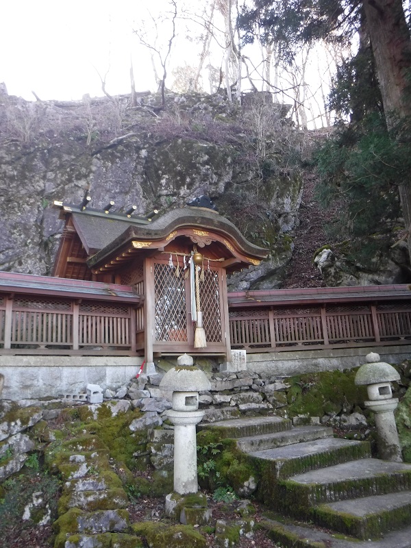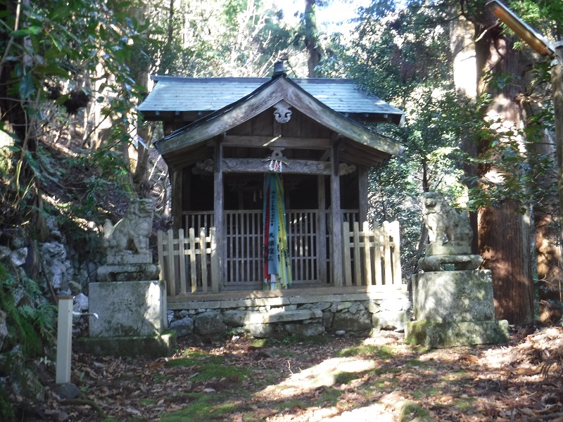 下り切ると男鬼峠で入谷に下る地点だが、分岐点○注のテープがあるのみで下谷という文字は無い。右の植林の谷を下って行くと石垣道が出てきて導いてくれる。集落手前の乗越には地蔵さんが祀ってあった。下った分岐には「男鬼入谷城跡→」という看板がありここに高取山城南尾根の道はつながっているようだ。そのまま入谷集落に入り、道路わきの新しいしめ縄の掛けられた鳥居から神社の参道を上る。