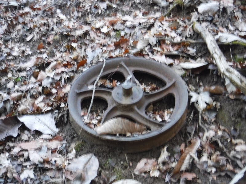 後谷に向かい、堰堤手前に駐車すると山肌に採石場の建物が見える。ジープが1台置いてあるが、人はいないようだ。堰堤を越えて大谷を行き、集落の取水場跡で水を入れる。コンクリートの橋のある堰堤を越えると左岸に苔むした巨大な石積みが見える。上っていくと石積みは何段にもわたって作られており、鉄製の滑車も落ちている。石積みは採石場まで続いており、落石防止の堰堤で水抜きも作られていた。