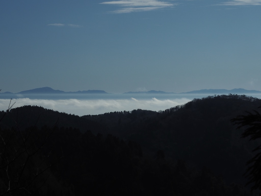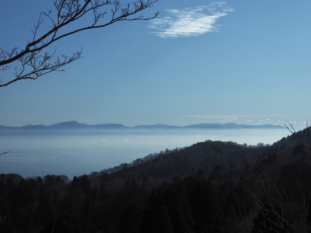 滝谷山へは植林地の急斜面をジグザグと登る。尾根に上がると途端になだらかで歩きやすい。尾根の東側からは樹間から南東の方角に、琵琶湖の上には広く雲海が広がり、鈴鹿の山々は茫洋とした白い海の上に浮かぶ島嶼のようだ。