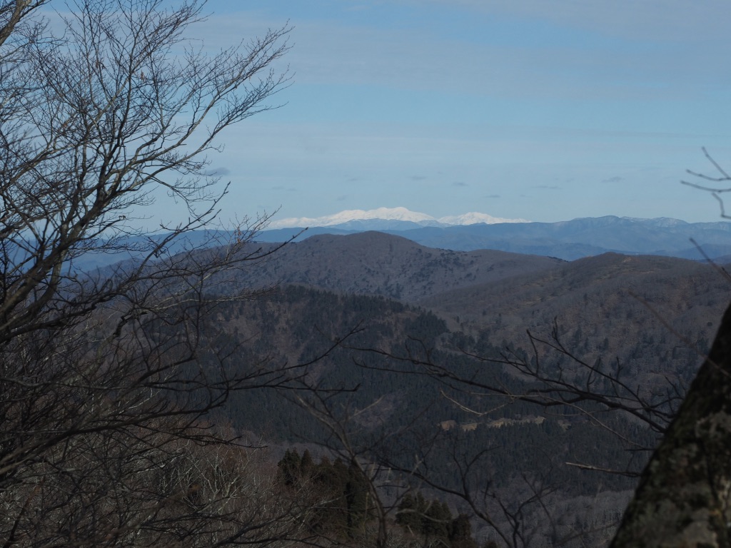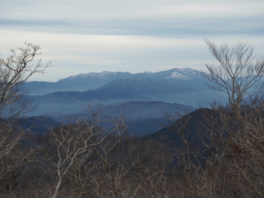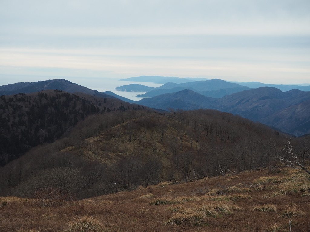 これらの山々の彼方には青白い乳液を流し込んだかのような若狭の海が広がっている。曇ってはいるものの遥かに彼方の山々まで眺めることが出来るのは冬の空気ならでは透明感のお陰