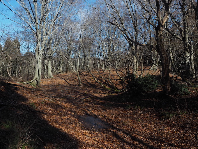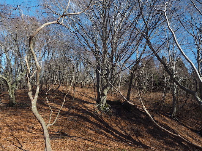 落合への南東の尾根は過去に二度ほど通ってはいるがいずれも新緑の季節なので、落葉した季節は初めてだ。山頂直下から始まる山毛欅の新緑が見事だと思っていたが、この日は延々と山毛欅の林の中を歩いてきたせいだろうか、山毛欅に対する感覚が麻痺してしまっている。
