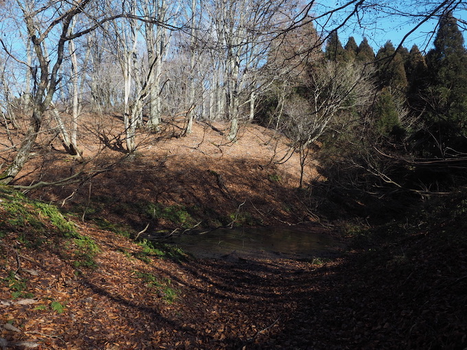 滝谷山の山頂は鬱蒼とした杉の植林の中の平地だが、滝谷山を越えると杉の植林はすぐにも終わり、なだらかな尾根には山毛欅の樹林が広がる。山毛欅の樹々はそれほど樹高は高くはないが、広々とした尾根に群生する山毛欅は迫力がある。いくつもの優美な起伏を描く広い尾根にはいくつかの小さな池が現れる。