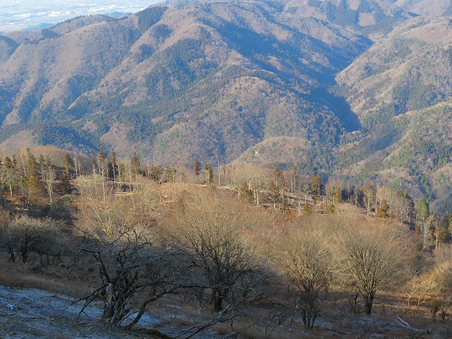 斜面を斜め下へ降りて行きます。やがて雑木がなくなって見通しのいい所へ来ます。前方に歩きやすそうな明瞭な尾根が