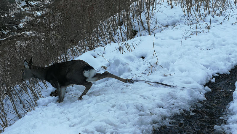どうやらワナに掛かってしまったらしい。逃げようとするが、進むに進めないシカ。足首にはワイヤーががっち