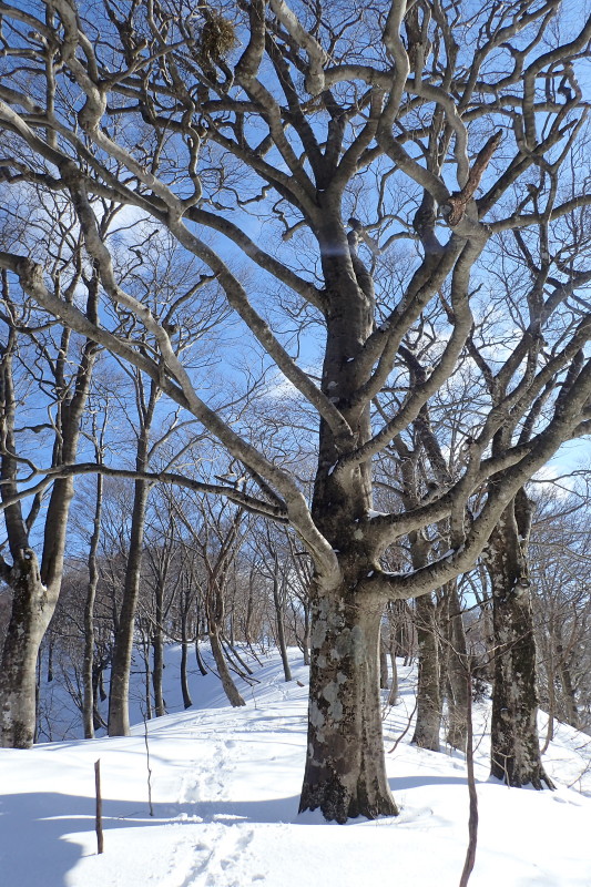 シャーベット状になった小さな池を横目で見て、コルから急登にかかる。この登りの途中にあるブナの巨木は一見の価値がある。腕をL字に上げたような枝を持つブナは、私が「剛腕ブナ」と呼んでいる、力強い立ち姿の ブナである。