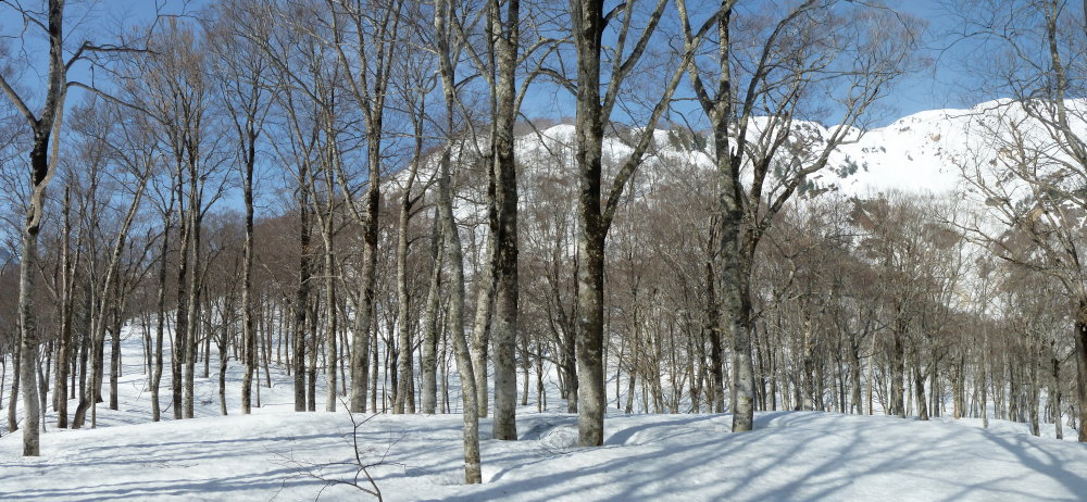 辺りの景色は、灌木のヤブから健やかなブナ林へと移り、膝上まで潜る雪に、息が切れるが、気持ちは軽くなる。
