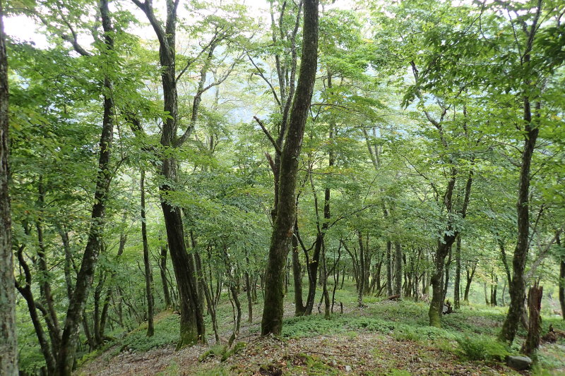 谷の形がなくなったところで右手の斜面に逃げた。もうひと登りでT字尾根に合流だ。このあたりはブナが多く、
