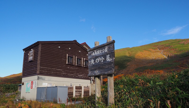 石畳の道から沢を渡ると滝の小屋から八丁坂、見上げる雄大な斜面に残雪の白、笹の緑そして錦秋の紅葉が広がっている。