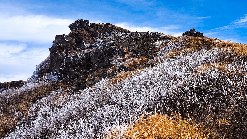 週間予報も3日前の予報も悪天だったものが、紅葉を照らす陽射しに加えて霧氷まで用意して迎えてくれた。