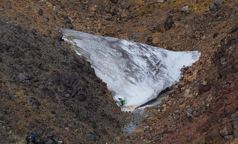 その残雪で何と先の単独男性がスキーをしているではないか!!!