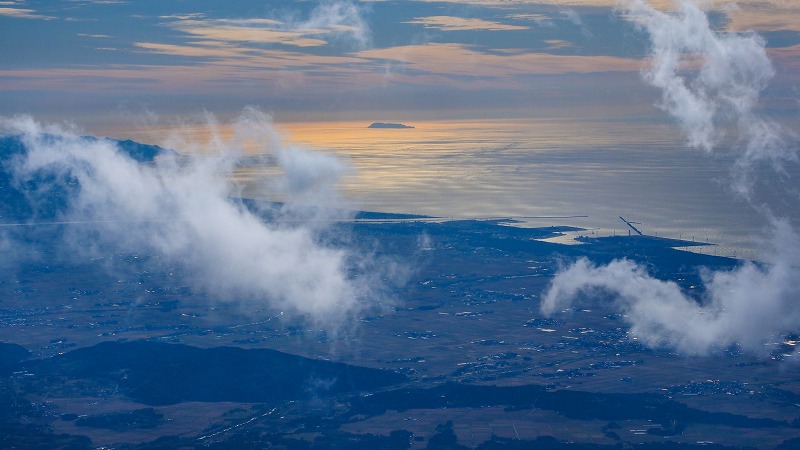 >降りの尾根からは日本海 西に飛島 そして、夕照の粟島を見ながらゆっくりと紅葉と霧氷の鳥海山に別れを告げた。