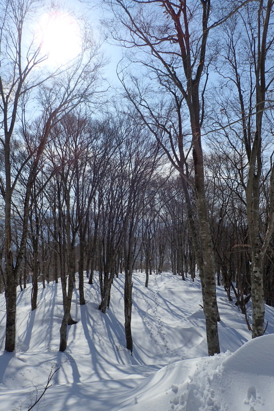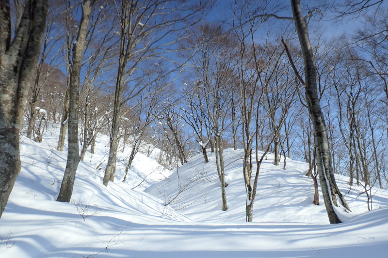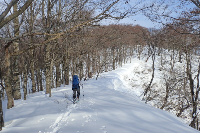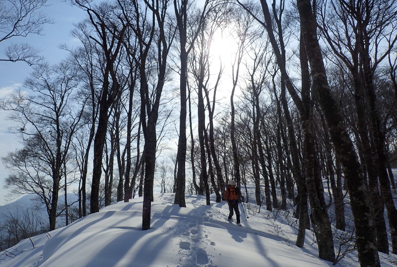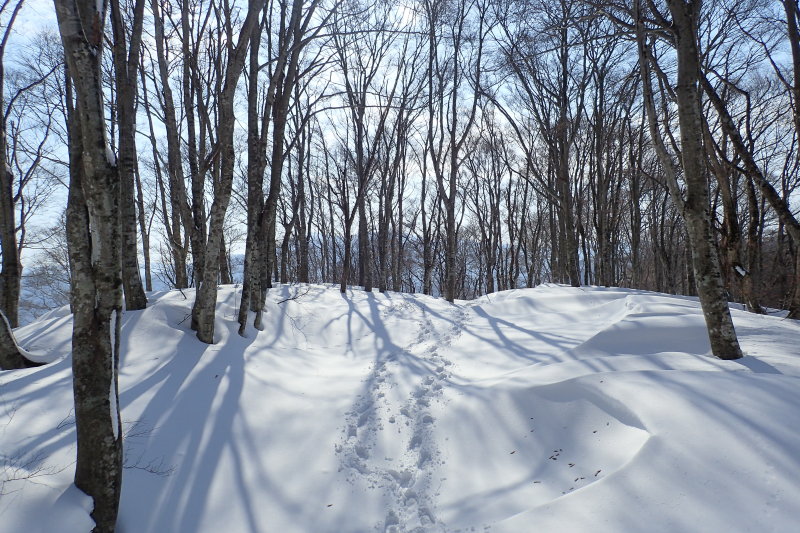 この尾根も細いながらブナ林が続く気持ちのいい尾根だ。雪は相変わらず重い。