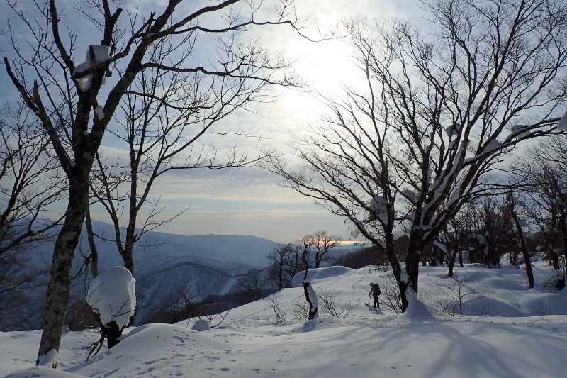 無雪期には潅木のバリアで展望皆無の山頂だが、潅木が雪の下となった今は展望は全開。