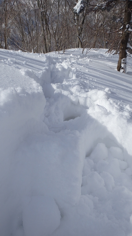 と思ったらちょっと違った。緩斜面はまだいいのだが、新雪が下の凍結面に乗った急斜面はシューが表層の雪ごと滑落してしまう。背中のザックで止まるから危険はないが、起き上がるのが一苦労。登るは地獄、下るは極楽~♪ と思っていたが、ちょっとヒヤヒヤの下山ロードとなった。