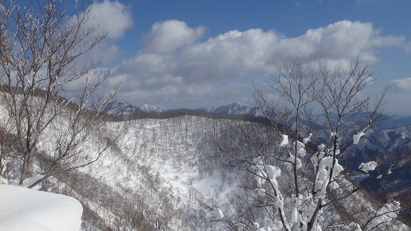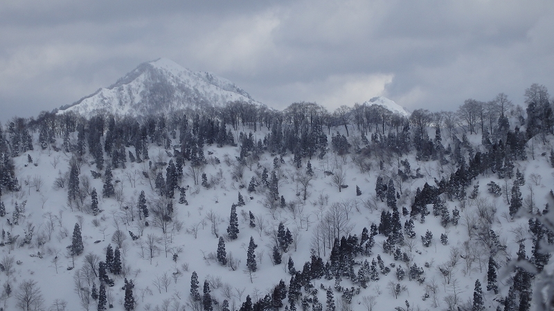 高度があがると左側の風景も変わってきた。そんなに遠くない先に二つ並んだ白い山頂が覗く。どこの山かな? 地図を頭の中に呼び出す。そうか!誰でもすぐ分かるだろう。この近辺、北方に聳える白い頂といえば高丸と烏帽子山。椀戸谷右岸の尾根が稜線の真ん中に突き上げている。いつぞやのスノー衆を思い出しながら目で稜線を追う。P1310437.jpg