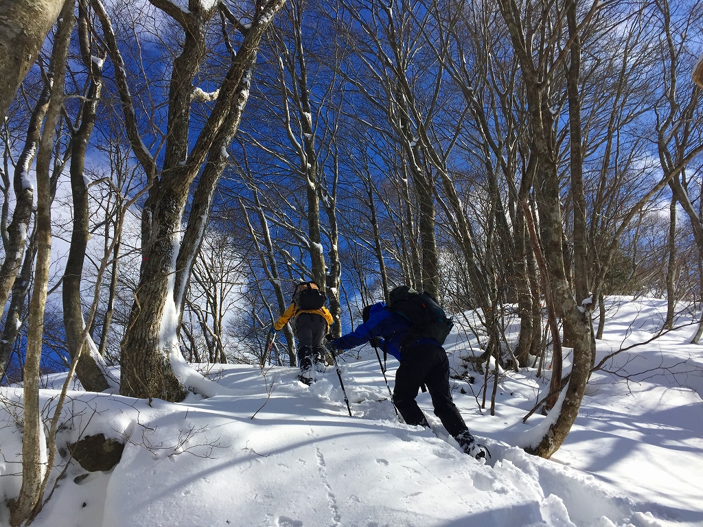 見せ場やアトラクションがあるわけではない。危険な緊張場面があるわけでもない。ただ、上に行くにつれ青空も顔を見せはじめた。太く高くなる見事なブナ林や、金糞岳の威容に励まされながら急登のラッセル。もう雑念を捨て、「どこまで」とか「何時までに」とかは考えない。開き直りと捨て身のアタックで目の前の壁のような敵をやっつけるだけなのだ。
