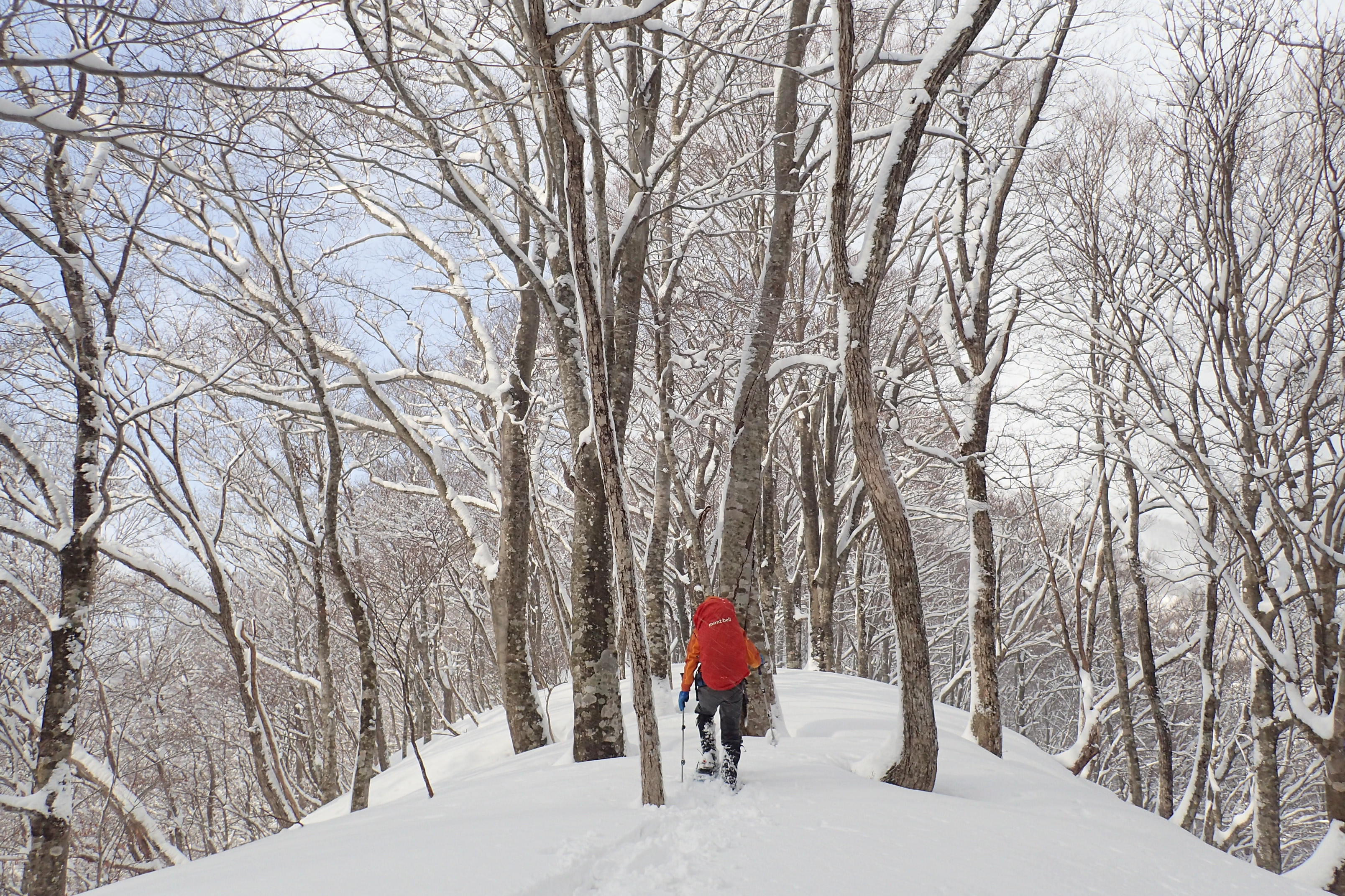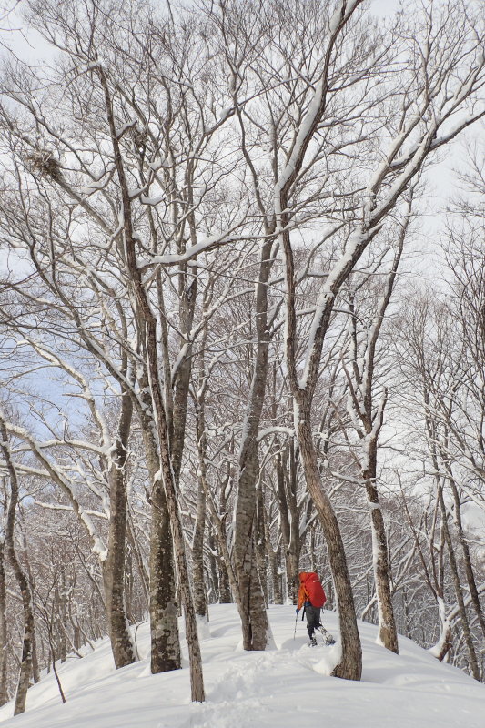 >白い帯となった雪尾根を辿る。もうミノマタが遠く感じることはない。アップダウンはあるものの、どこまでも続くブナ林は疲れを感じさせない。こういうところを歩きたいのだけれど…。