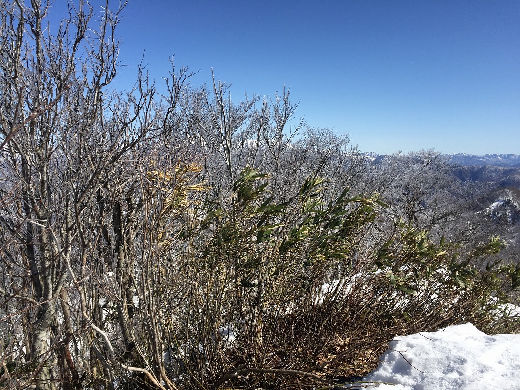 遠目には霧氷かと見えた樹林は、ただ枝の上に雪が載っているだけだった。