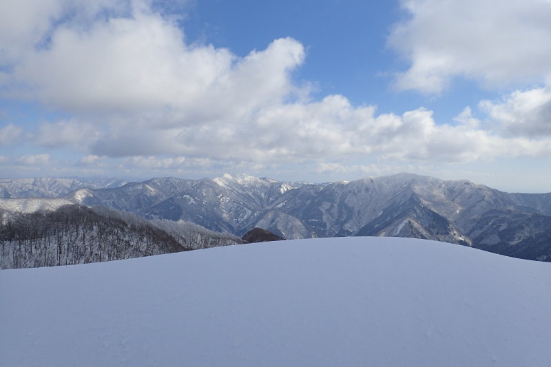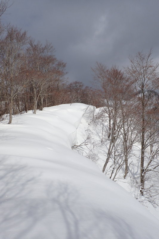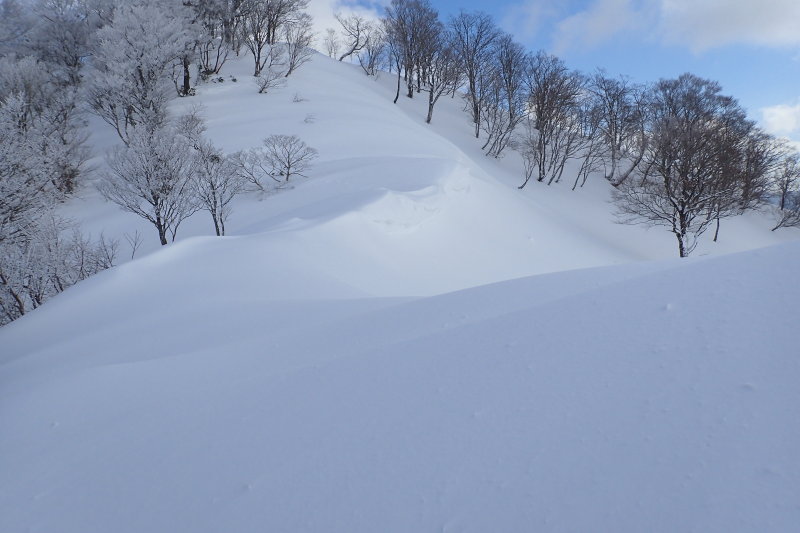 北側の展望が一気に開け、能郷白山を始めとする越美国境稜線の展望が全開となり、心躍る風景に眼が釘付けになった。雪原状となった広大な雪尾根に心が開放される。雪のうねりが生クリームのように滑らかで柔らかい曲線を描いていた。