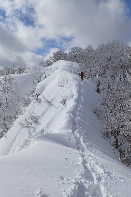 ている。スパッと切れ落ちた南側には芸術的とも思えるさまざまな形の雪庇が張り出し、慎重な行動が求められる場